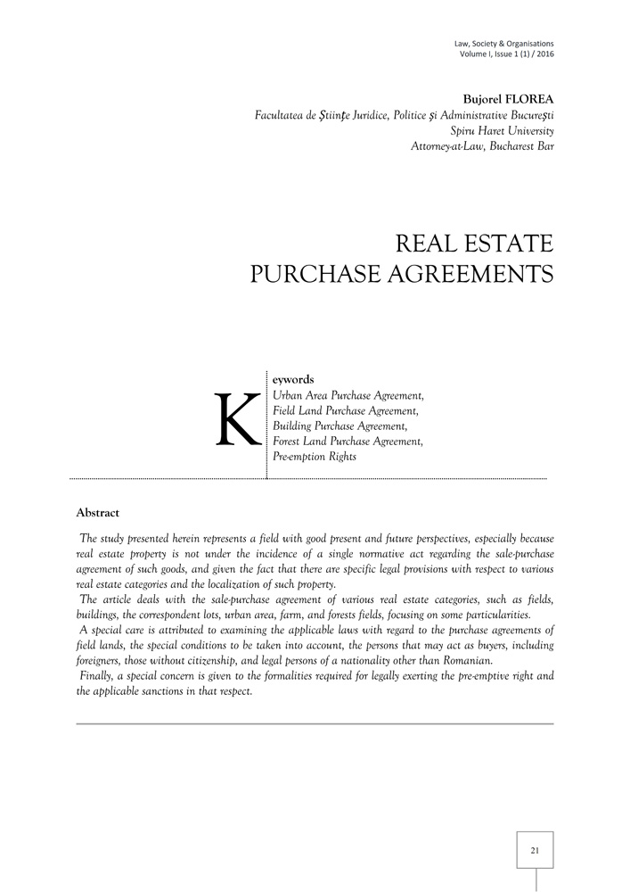 The study presented herein represents a field with good present and future perspectives, especially because real estate property is not under the incidence of a single normative act regarding the sale-purchase agreement of such goods, and given the fact that there are specific legal provisions with respect to various real estate categories and the localization of such property. The article deals with the sale-purchase agreement of various real estate categories, such as fields, buildings, the correspondent lots, urban area, farm, and forests fields, focusing on some particularities. A special care is attributed to examining the applicable laws with regard to the purchase agreements of field lands, the special conditions to be taken into account, the persons that may act as buyers, including foreigners, those without citizenship, and legal persons of a nationality other than Romanian. Finally, a special concern is given to the formalities required for legally exerting the pre-emptive right and the applicable sanctions in that respect.