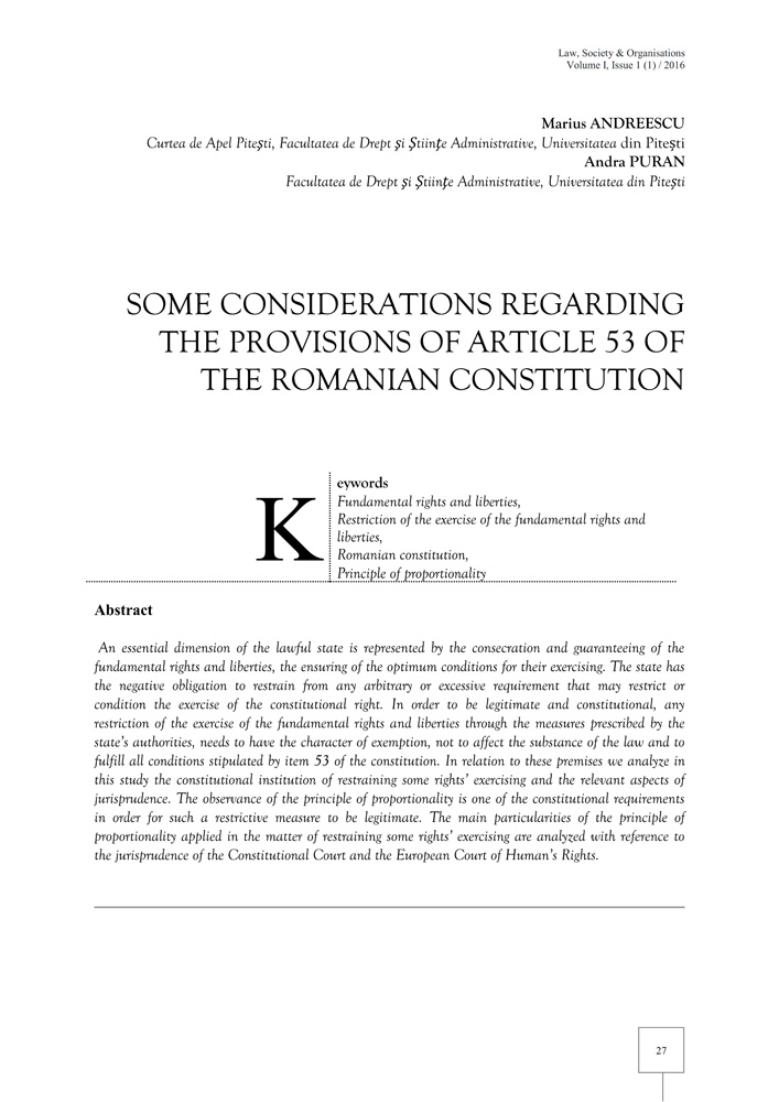 - Keywords: Fundamental rights and liberties, Restriction of the exercise of the fundamental rights and liberties, Romanian constitution, Principle of proportionality