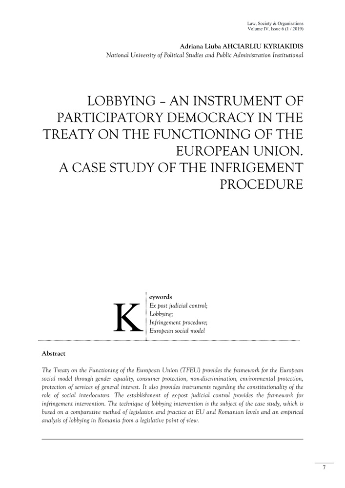 The Treaty on the Functioning of the European Union (TFEU) provides the framework for the European social model through gender equality, consumer protection, non-discrimination, environmental protection, protection of services of general interest. It also provides instruments regarding the constitutionality of the role of social interlocutors. The establishment of ex-post judicial control provides the framework for infringement intervention. The technique of lobbying intervention is the subject of the case study, which is based on a comparative method of legislation and practice at EU and Romanian levels and an empirical analysis of lobbying in Romania from a legislative point of view.