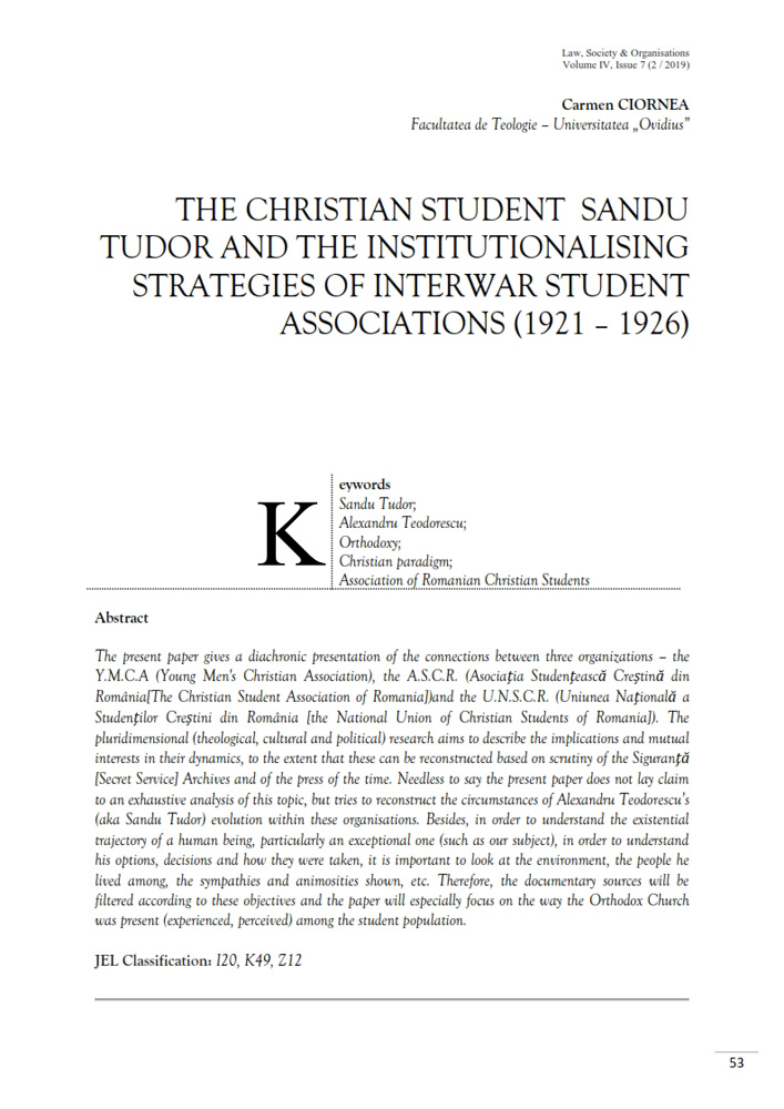 The present paper gives a diachronic presentation of the connections between three organizations – the Y.M.C.A (Young Men's Christian Association), the A.S.C.R. (Asociația Studențească Creștină din România[The Christian Student Association of Romania])and the U.N.S.C.R. (Uniunea Națională a Studenților Creștini din România [the National Union of Christian Students of Romania]). The pluridimensional (theological, cultural and political) research aims to describe the implications and mutual interests in their dynamics, to the extent that these can be reconstructed based on scrutiny of the Siguranţă [Secret Service] Archives and of the press of the time. Needless to say the present paper does not lay claim to an exhaustive analysis of this topic, but tries to reconstruct the circumstances of Alexandru Teodorescu’s (aka Sandu Tudor) evolution within these organisations. Besides, in order to understand the existential trajectory of a human being, particularly an exceptional one (such as our subject), in order to understand his options, decisions and how they were taken, it is important to look at the environment, the people he lived among, the sympathies and animosities shown, etc. Therefore, the documentary sources will be filtered according to these objectives and the paper will especially focus on the way the Orthodox Church was present (experienced, perceived) among the student population.