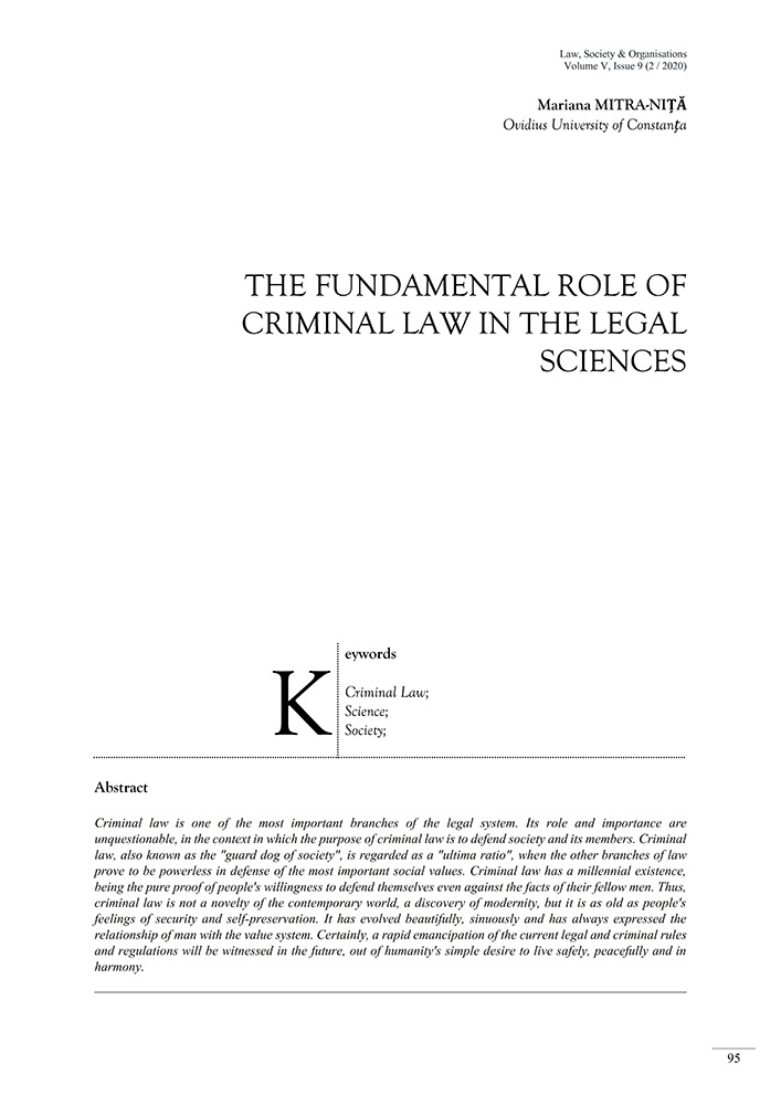 Criminal law is one of the most important branches of the legal system. Its role and importance are unquestionable, in the context in which the purpose of criminal law is to defend society and its members. Criminal law, also known as the "guard dog of society", is regarded as a "ultima ratio", when the other branches of law prove to be powerless in defense of the most important social values. Criminal law has a millennial existence, being the pure proof of people's willingness to defend themselves even against the facts of their fellow men. Thus, criminal law is not a novelty of the contemporary world, a discovery of modernity, but it is as old as people's feelings of security and self-preservation. It has evolved beautifully, sinuously and has always expressed the relationship of man with the value system. Certainly, a rapid emancipation of the current legal and criminal rules and regulations will be witnessed in the future, out of humanity's simple desire to live safely, peacefully and in harmony.